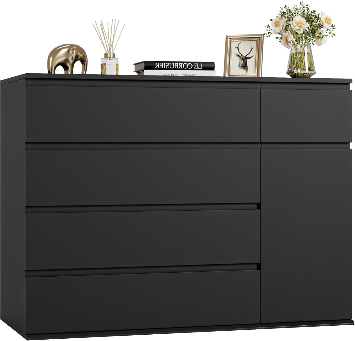 More storage with Five Drawers & 1 Door: With a large capacity of 5 drawers and a 2-shelves cabinet with door, the FOTOSOK black dresser can meet most of your storage needs. Documents and books, beauty and skin care, daily sundries, etc. can be placed in this exquisite black double dresser.