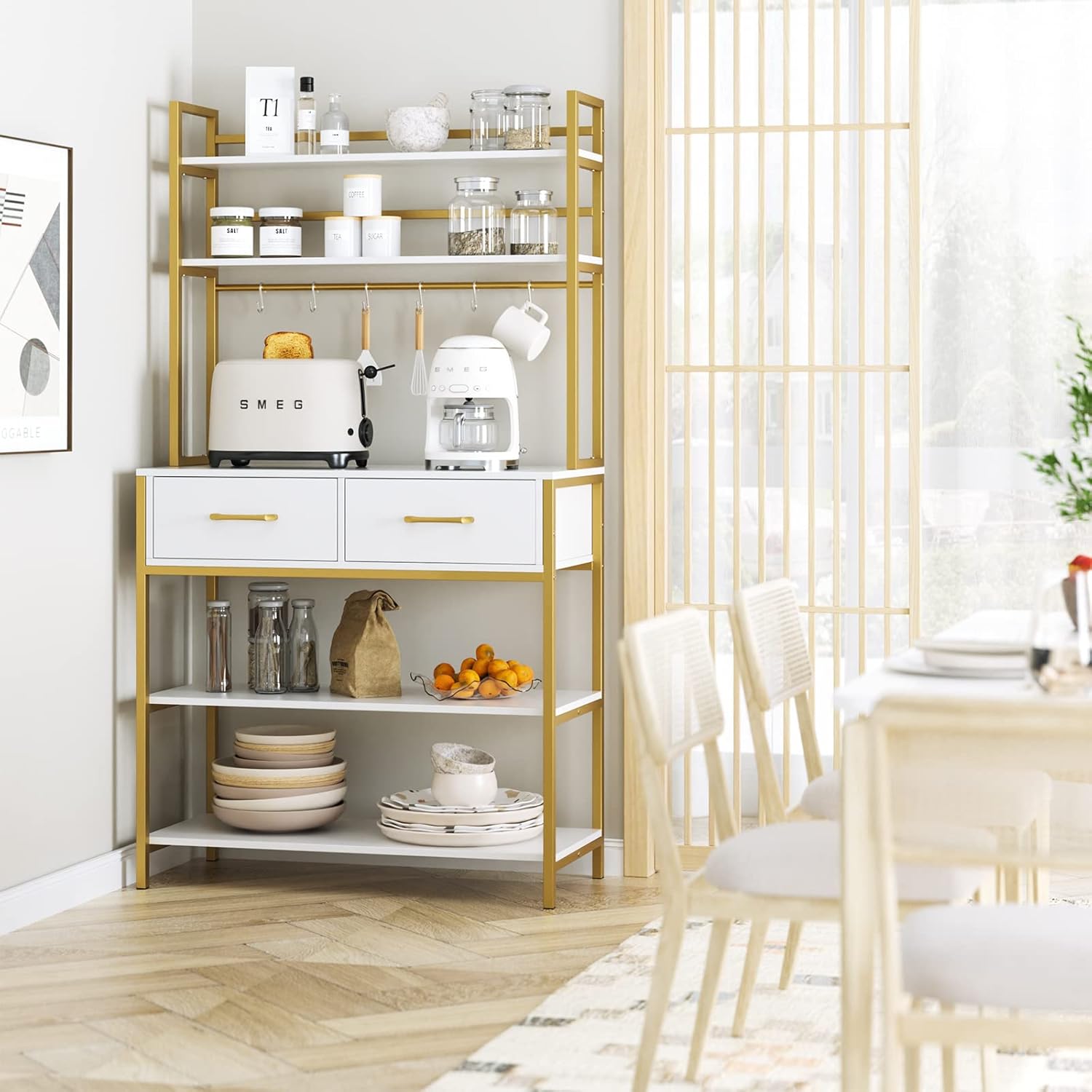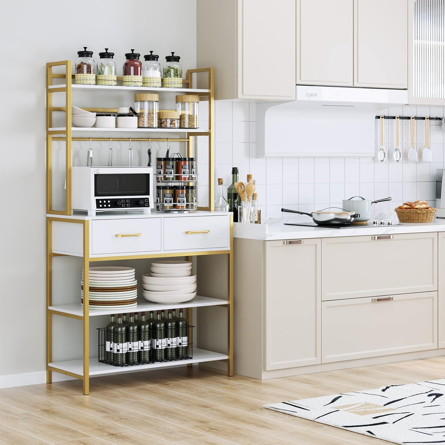 Plenty of Storage Space Kitchen cabinet expands storage space vertically to accommodate more items, and the open compartments are designed for easy access. 5 shelves in different sizes, 6 hooks and 2 drawers for storing small appliances, spice jars and other kitchen utensils