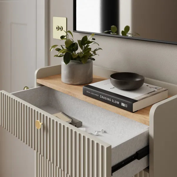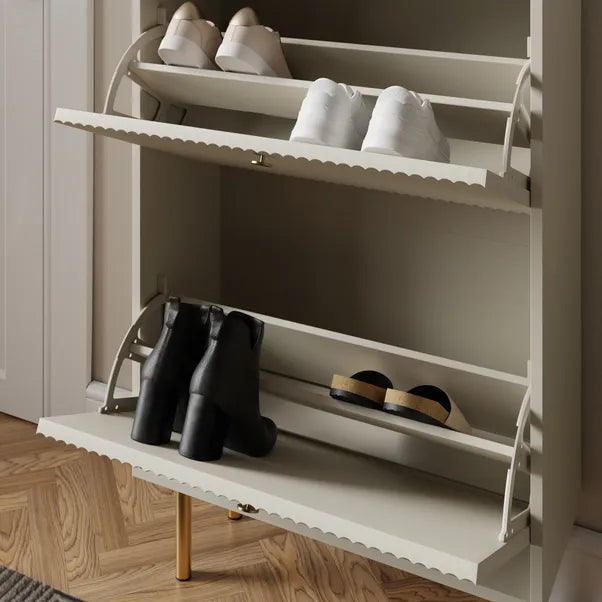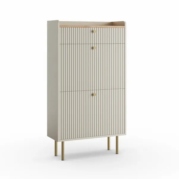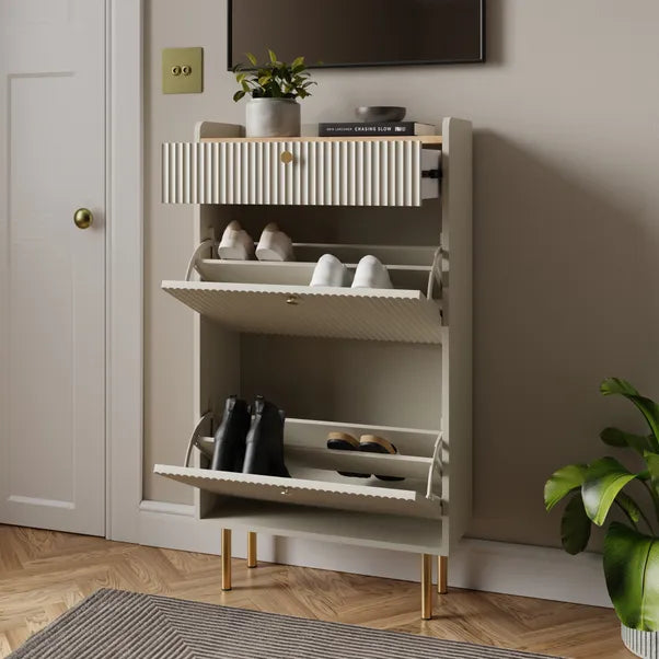 This shoe cabinet combines beautiful style with practical storage solutions. With two tiers that fold out to accommodate shoes and an additional top storage drawer for smaller items, your entrance space will always look fabulous and organized. Designed with a slim profile to make the best use of narrow areas, this shoe storage unit is perfect for maximising space efficiency in your home. It can accommodate up to 8 pairs of shoes up to UK Size 9, ensuring your footwear is neatly tucked away while offering a convenient display option.