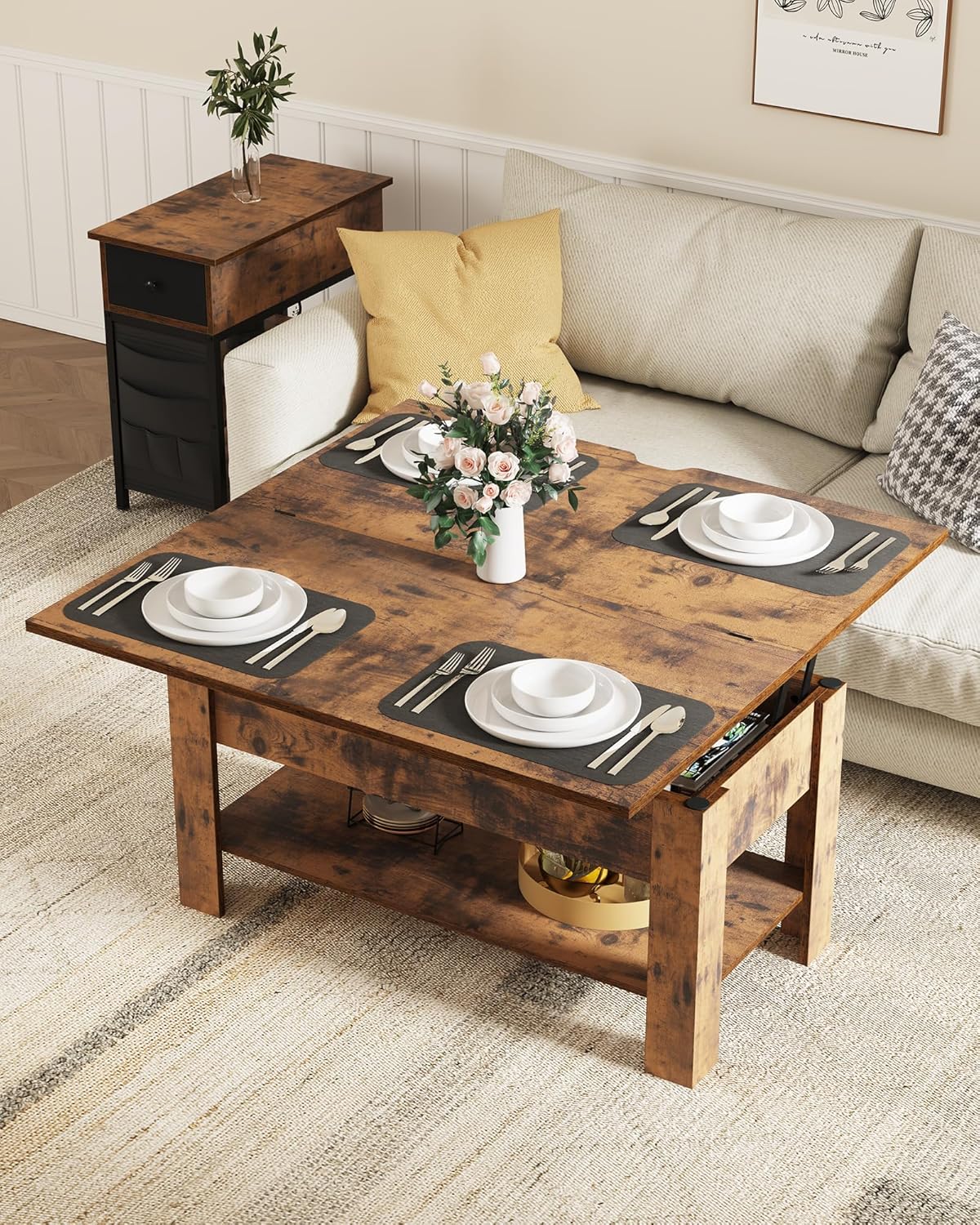 Compact & Expandable: This 3-in-1 lift-top coffee table (50×100×46.5 cm) expands to 100×100×62 cm—perfect for small rooms.