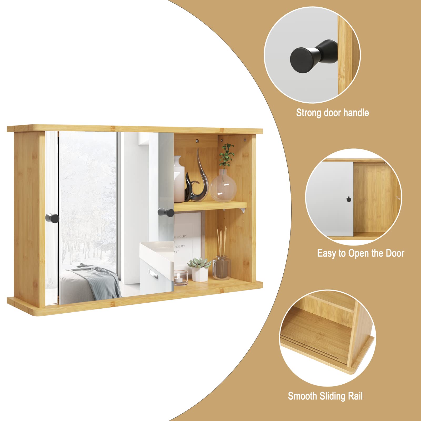 Mirror Cabinet for Bathroom, Bathroom Cabinet with Mirrors, Hanging Bathroom Cabinet with Sliding Doors, Wall Cabinet for Bathroom, with Adjustable Shelf, Made of Bamboo, 55 x 35.5 x 14