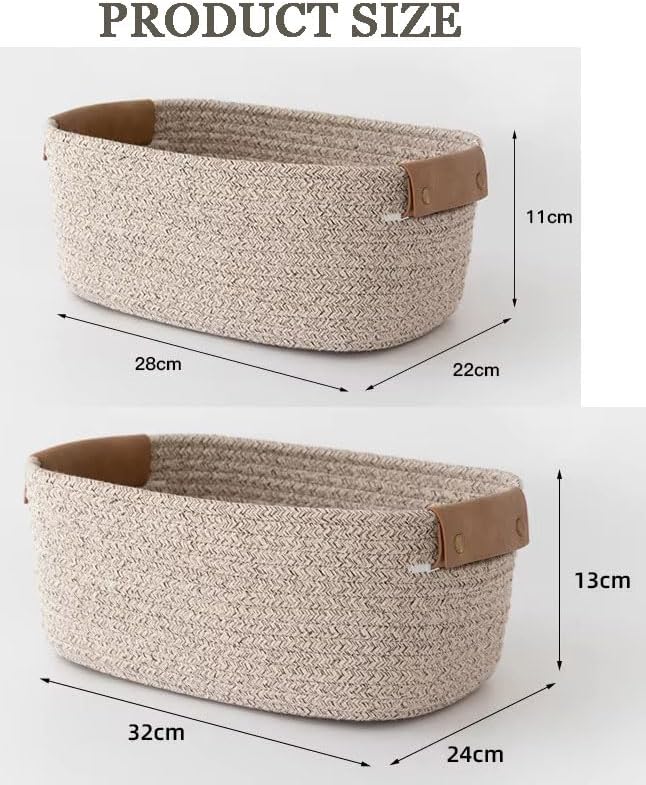 WOVEN COTTON BASKET: Set of 2 white storage baskets with elegant leather handles, 28*22*11/32*24*13cm. Its large capacity makes it an excellent choice to keep your space beautiful, tidy and organized. It is easy to carry and the perfect solution to your household mess!