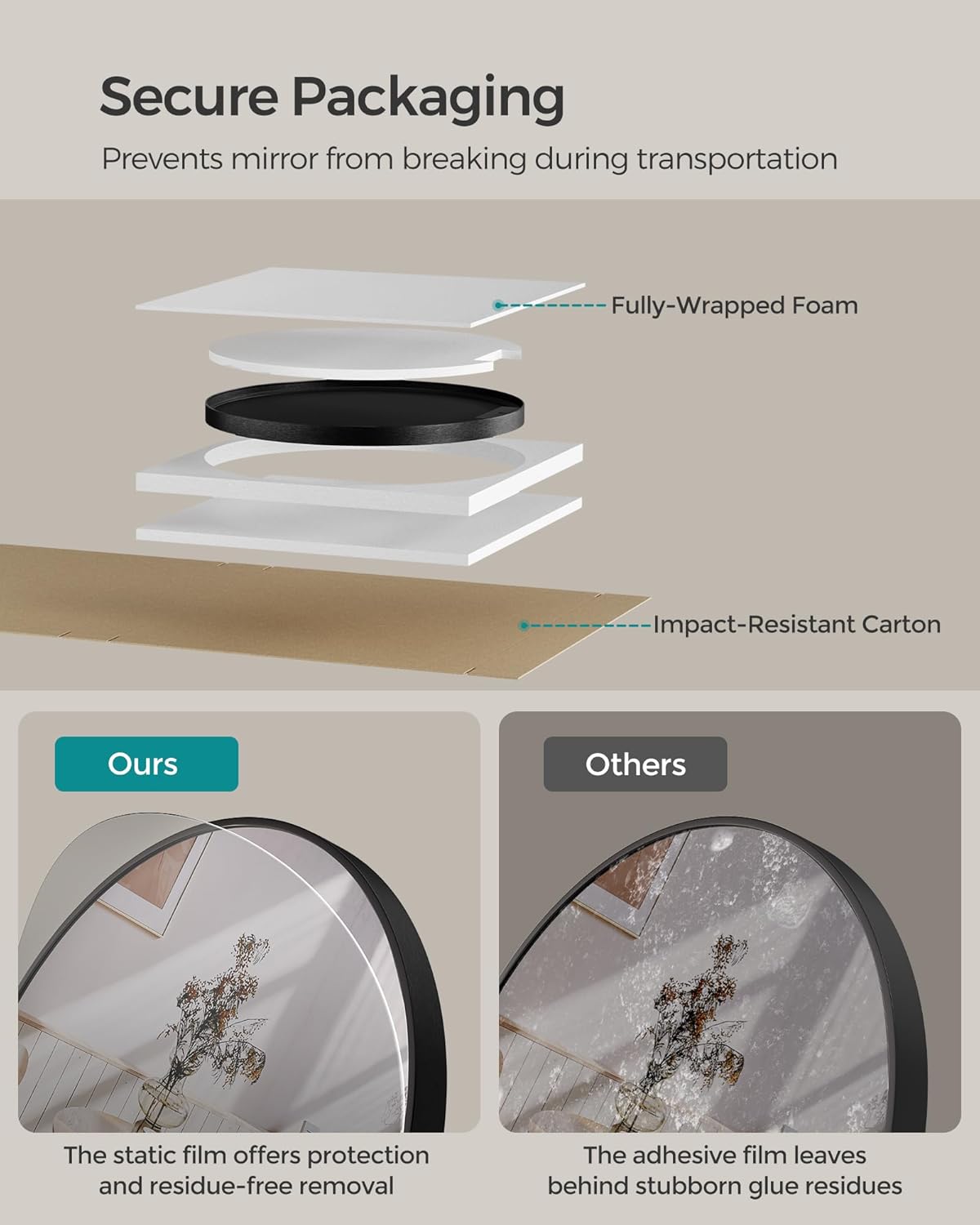 [Built to Last, Designed to Impress] The aluminium alloy frame, crafted with a brushed finish, seamlessly combines with the 5 mm thick glass, making the round mirror sturdy and durable. Let it be your reliable companion through daily moments!