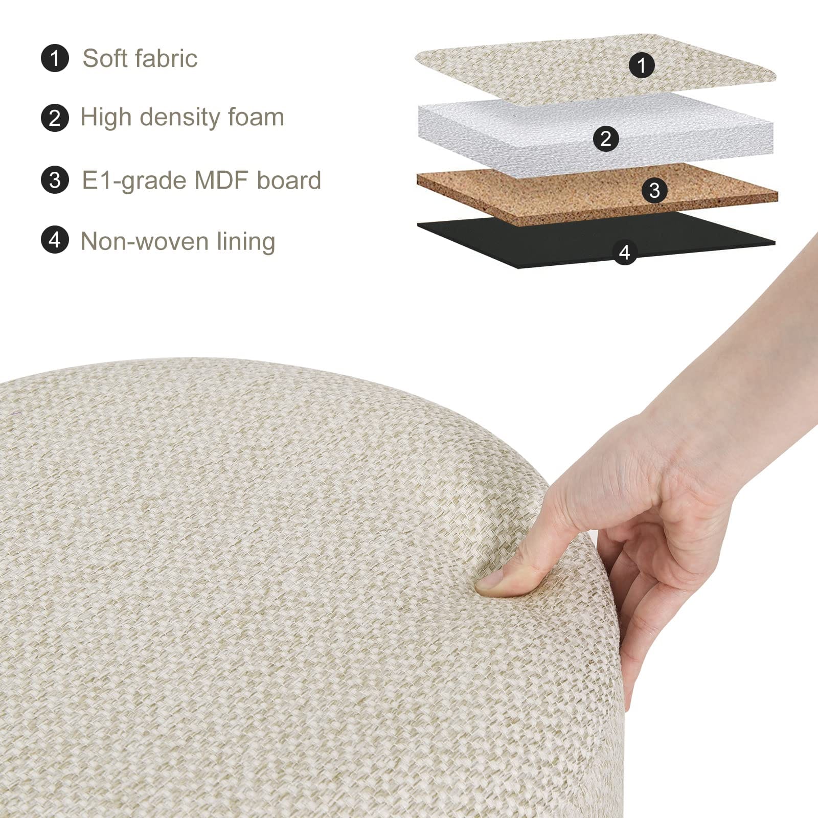 Stool with Storage Space, Round Stool, Footstool with Lid, Padded Stool with Solid Wood Legs, Linen Cover, Diameter 39 x 33 cm, Cream White