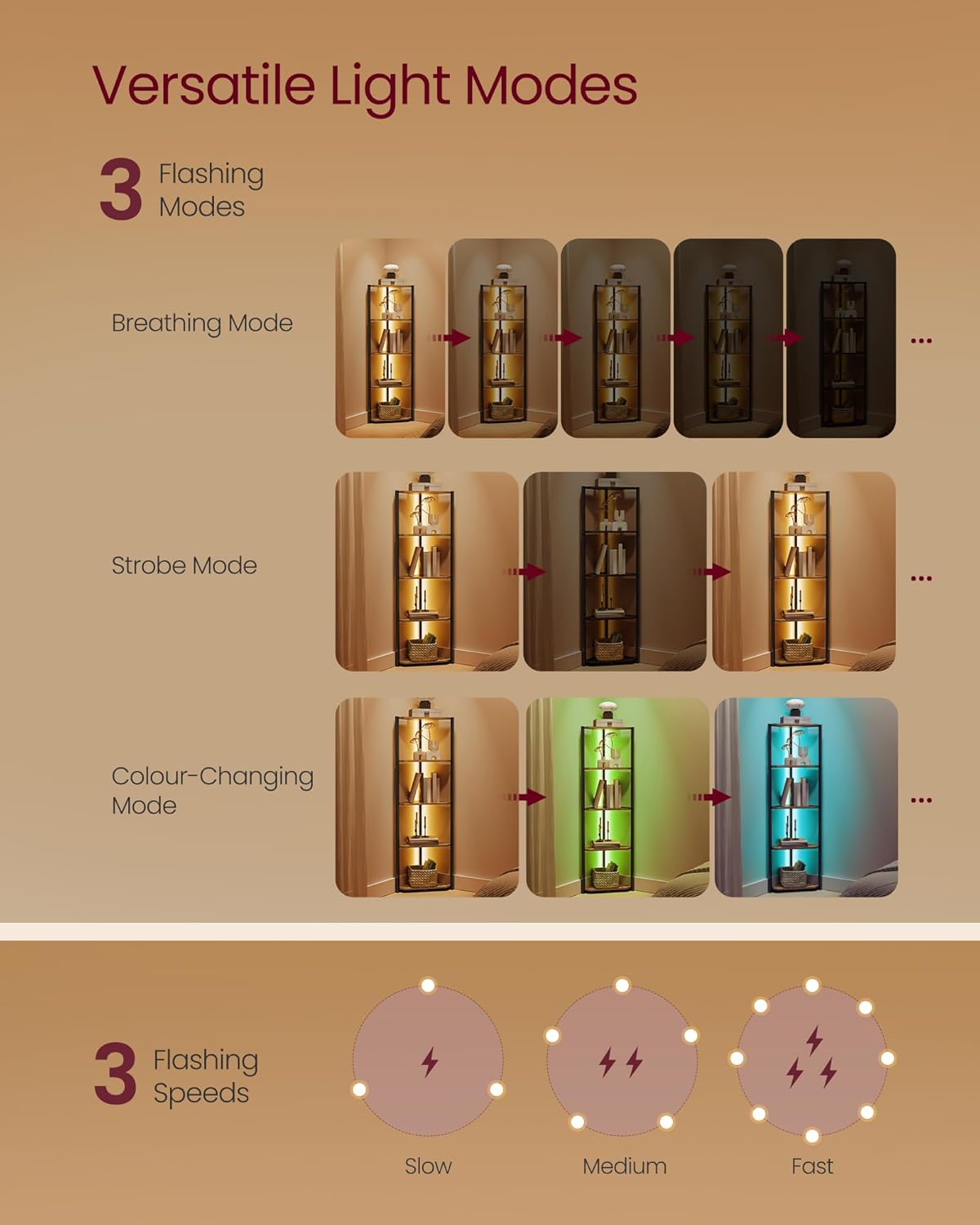 ?ADJUSTABLE LED LIGHTS?This bookshelf features LED lights with 7 colours, 7 brightness modes, and 3 flashing modes with 3 flashing speeds, to create a unique atmosphere. You can easily adjust the lights with the included remote