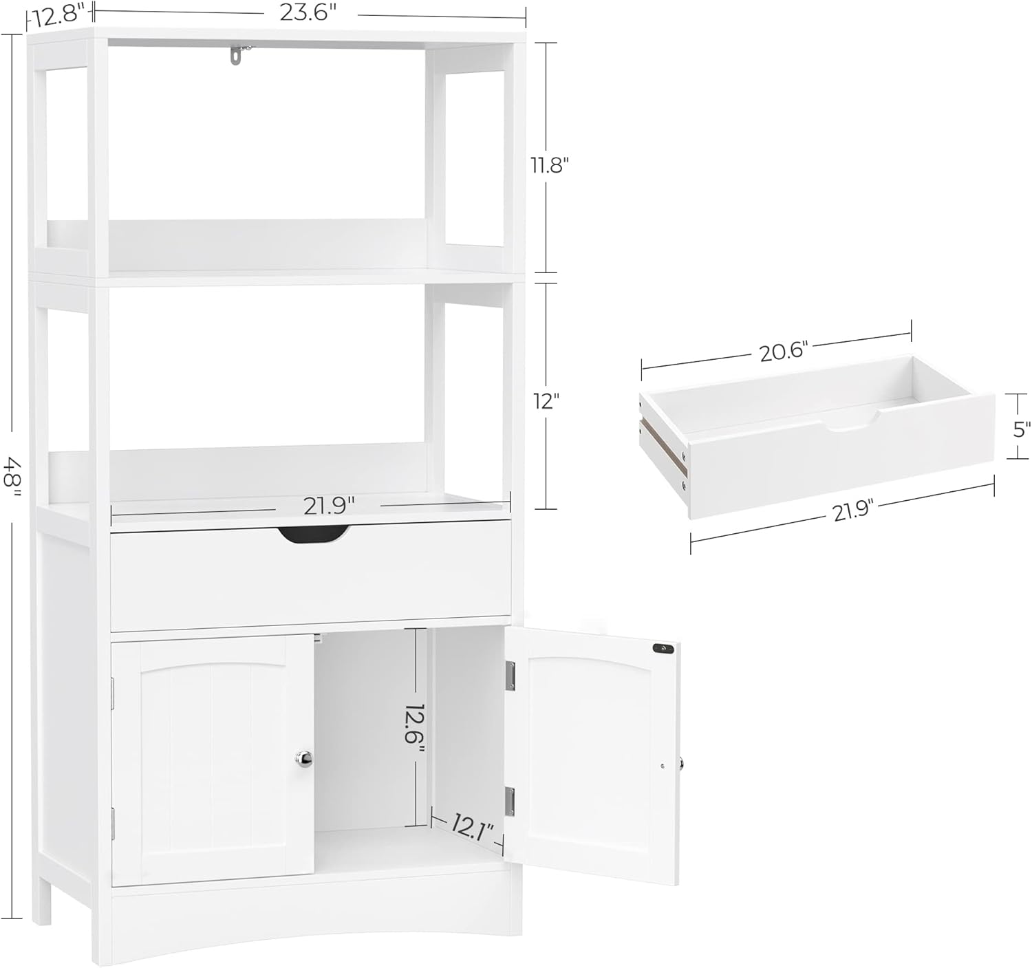 [Large, Categorized Storage] 2 open shelves for oft-used items, a drawer and a bottom cabinet that hide your extra toilet paper and cleaning supplies-this spacious bathroom cabinet keeps everything you need neatly organized.