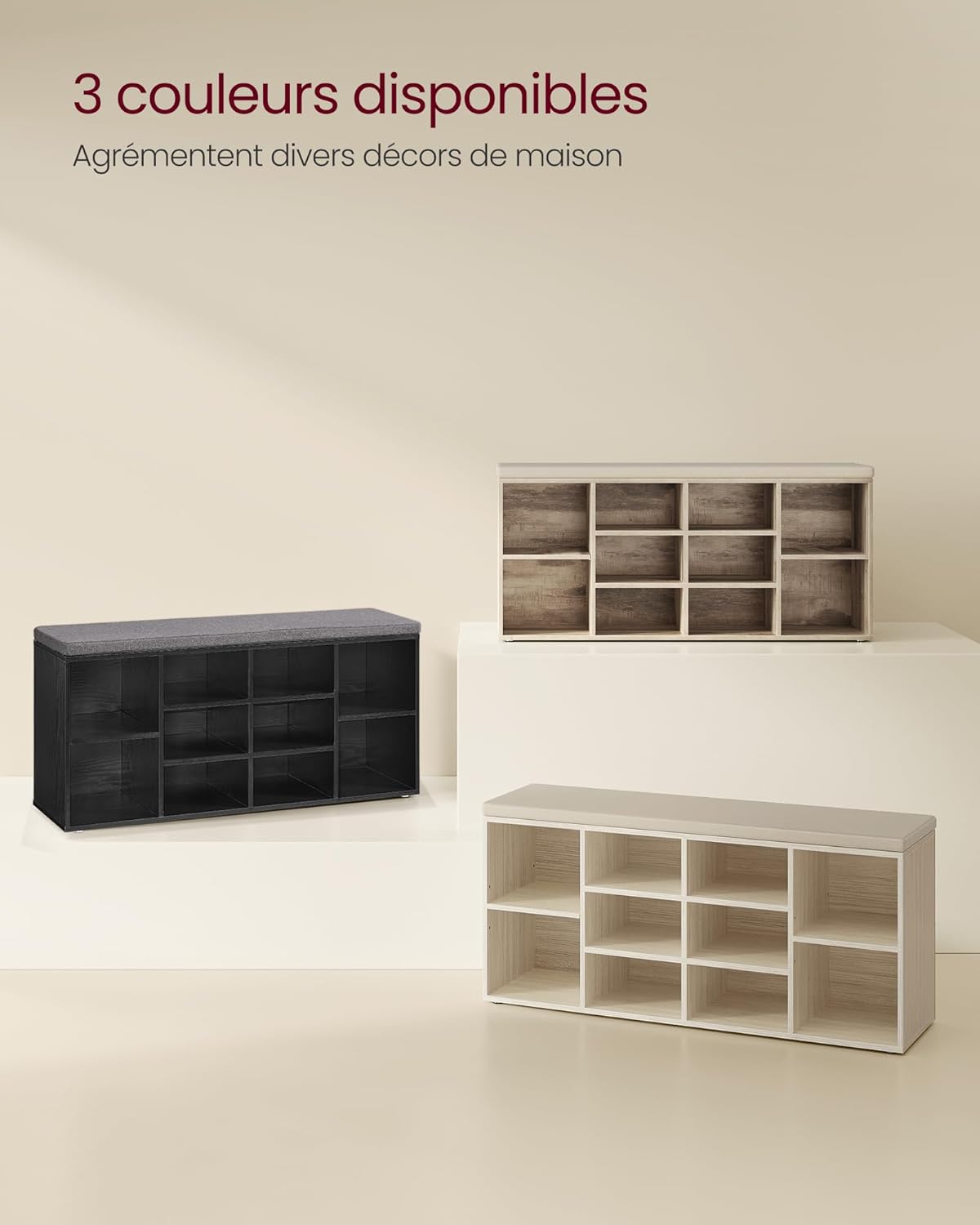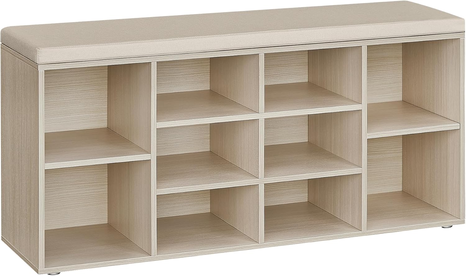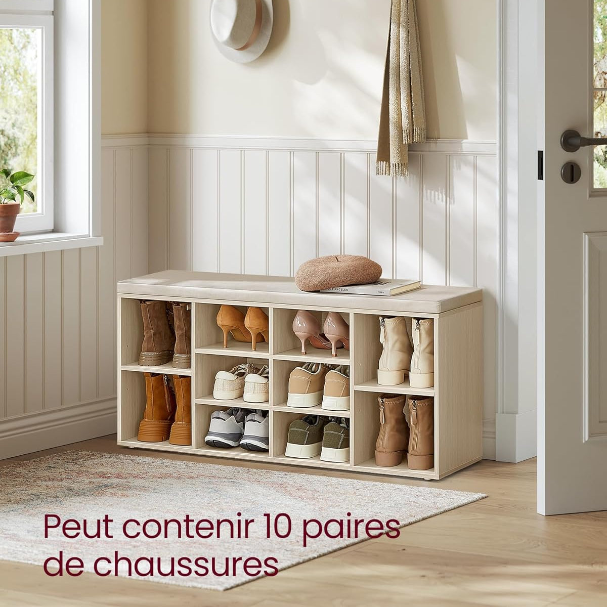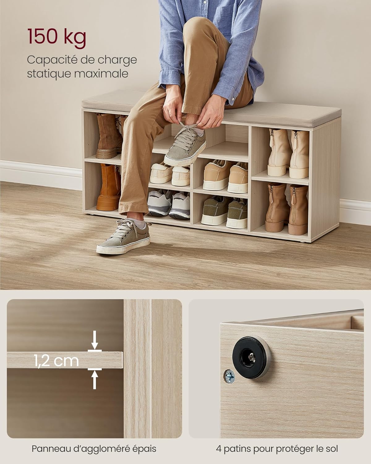 ?Solid, stable and non-scratching?Made of quality chipboard, this storage bench, capable of supporting up to 150 kg, offers a solid seat without wobbling. In addition, it includes 6 pads underneath to protect your floors from scratches