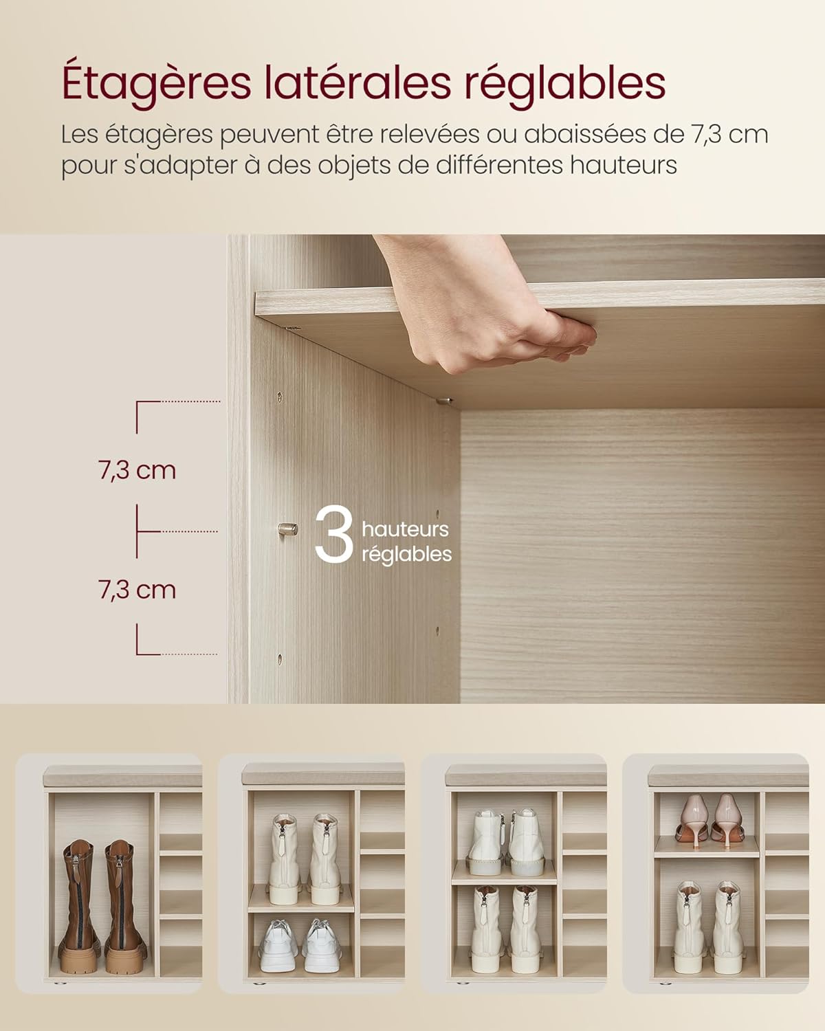 ?MULTIPLE STORAGE?10 open compartments with a depth of 29.7 cm make it easy to access your shoes. The 4 side compartments have adjustable and removable dividers for higher shoes, such as boots or high heels