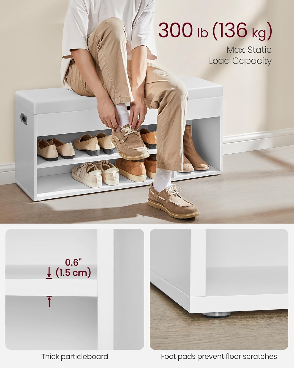 [Robust and Long-Lasting Quality] Crafted from 15 mm quality particleboard panels, this entryway bench boasts a weight capacity of 150 kg. Say goodbye to wobbles and squeaks, and enjoy its strong and durable design for years to come