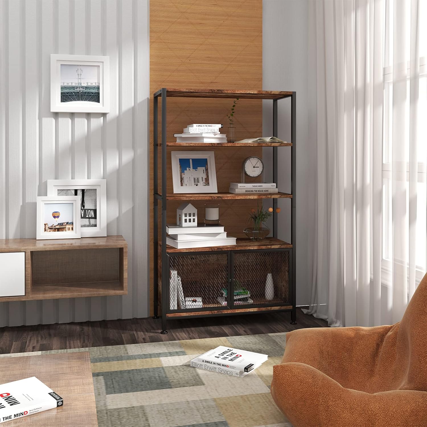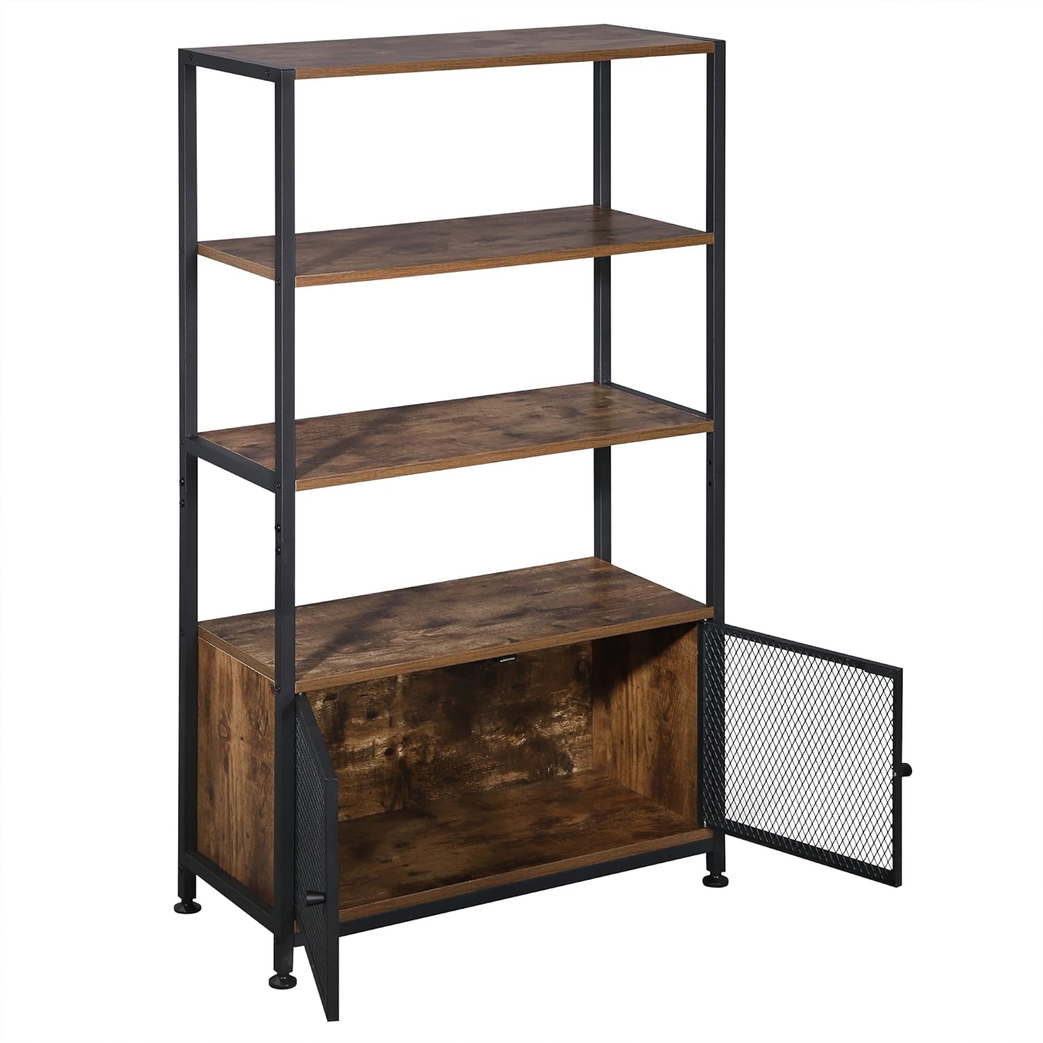 COUNTRY STYLE AND INDUSTRIAL STYLE: The simple design and color scheme make the shelf perfectly combines modernity with the vintage. Mainly it has a vintage look. Together with the black metal frame and the black metal mesh doors, the bookcase looks elegant and stylish