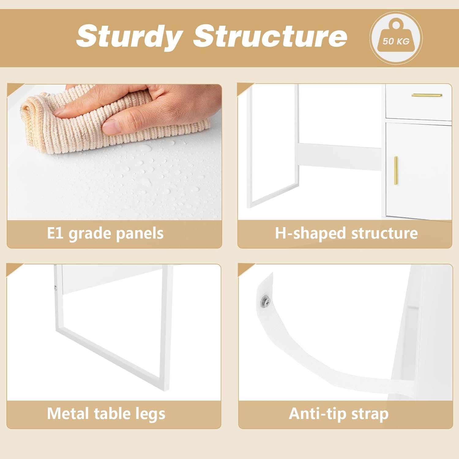 SAFE USE AND EASY ASSEMBLY: Attach the white makeup desk to the wall with the included anti-tip device for safer use. With the detailed manual, tools and accessories provided, it is easy to assemble. The product is divided into 2 packages
