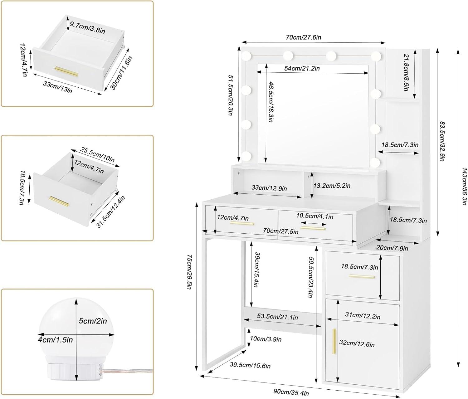 STABLE AND STURDY: Constructed from high quality particleboard, metal legs and reinforced bottom beam, the bedroom dressing table with lights is stable, sturdy and easy to clean, so that you can enjoy long-lasting use. Load capacity: 50kg