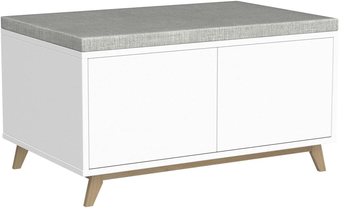 This elegant wooden shoe bench combines functionality with refined aesthetics. The integrated cushioned seat provides comfortable seating while you change shoes, making it an essential entryway piece. Its streamlined white finish complements any interior design scheme seamlessly. Engineered for compact spaces, the 38 cm width fits perfectly in narrow hallways without compromising storage capacity. The adjustable compartments on both sides accommodate diverse footwear—from athletic shoes to stilettos and tall boots—allowing you to customize the configuration to your specific needs. Dimensions: L 84 x W 38 x H 49 cm. A sophisticated storage solution that marries practicality with contemporary design.